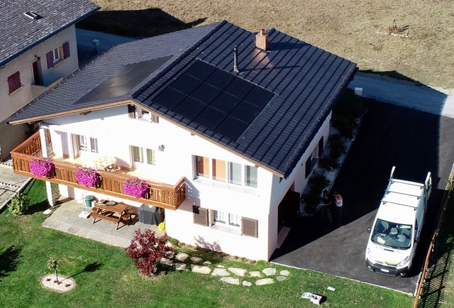 Couverture de la toiture en tuile solaire photovoltaïque. Le toit comporte également des panneaux solaires thermiques ainsi que 3 vélux.